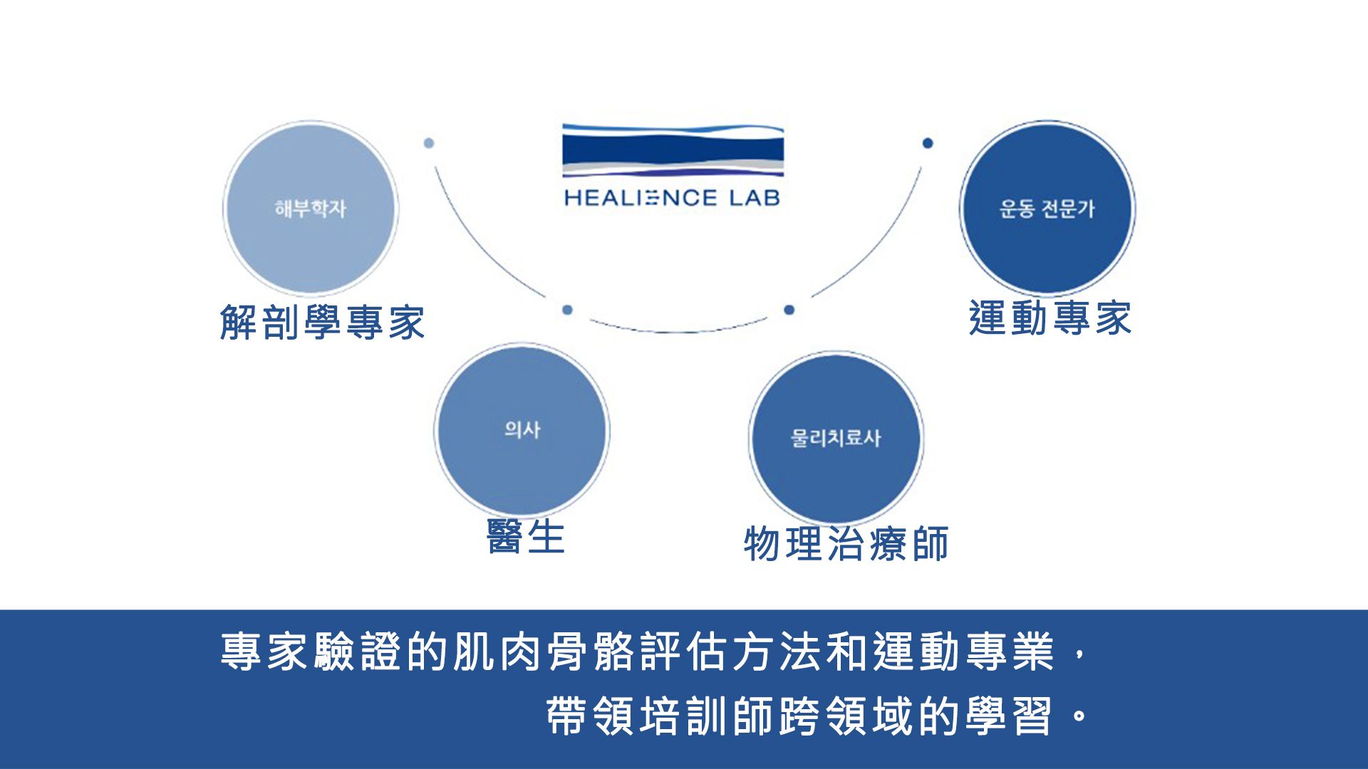 亞洲唯一跨領域的認證制度 - 與韓國大熊製藥旗下Healience Lab合作醫生、解剖學家、物理治療師、訓練師、彼拉提斯和瑜珈教練齊聚一堂,共用獨特專業知識的培訓體系。透過HLA聯盟以及與全球專家的合作,目標是建立醫師與理療專業人員信任,可以為一般人提供運動康復專業建議與指導的導師團隊。