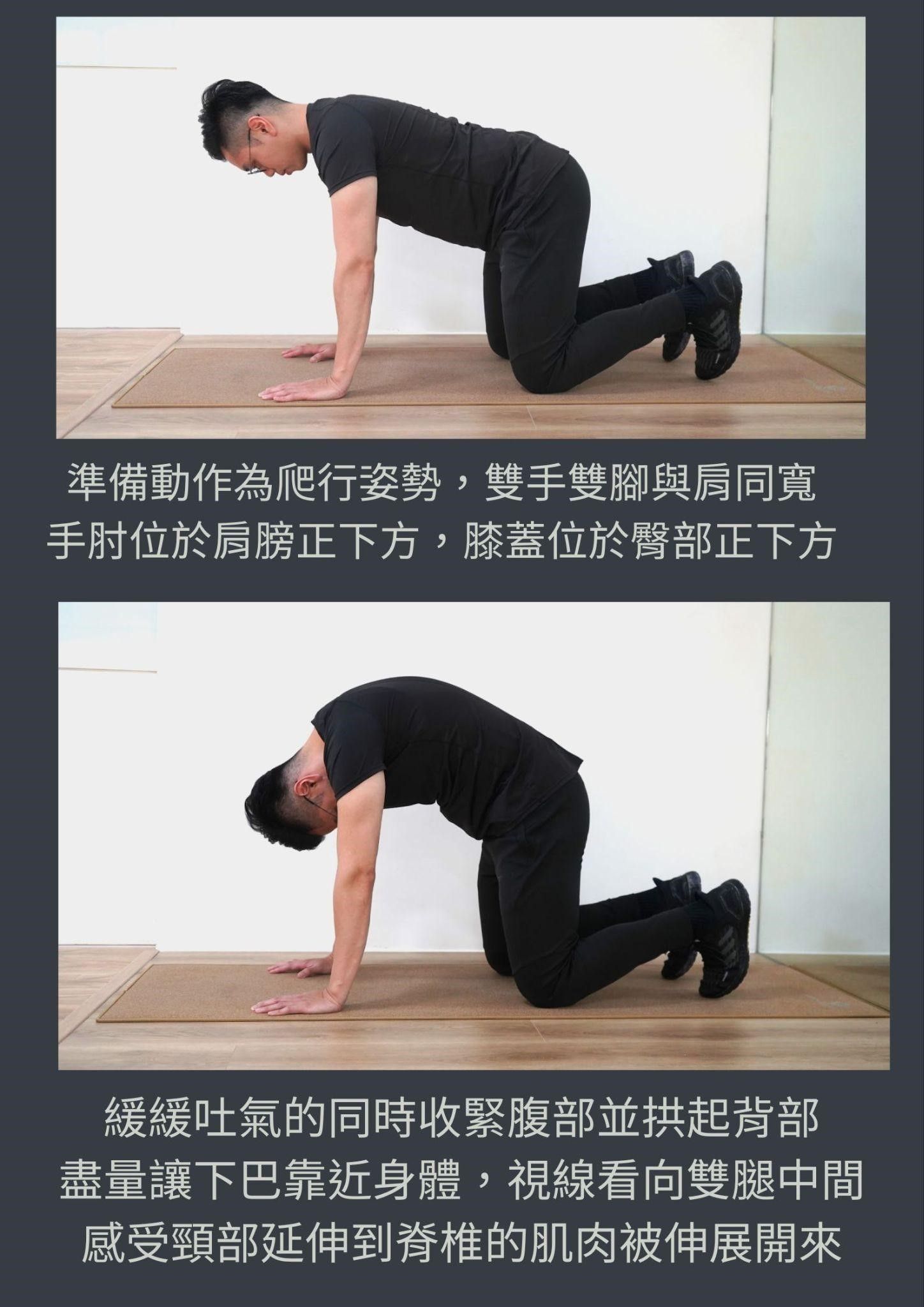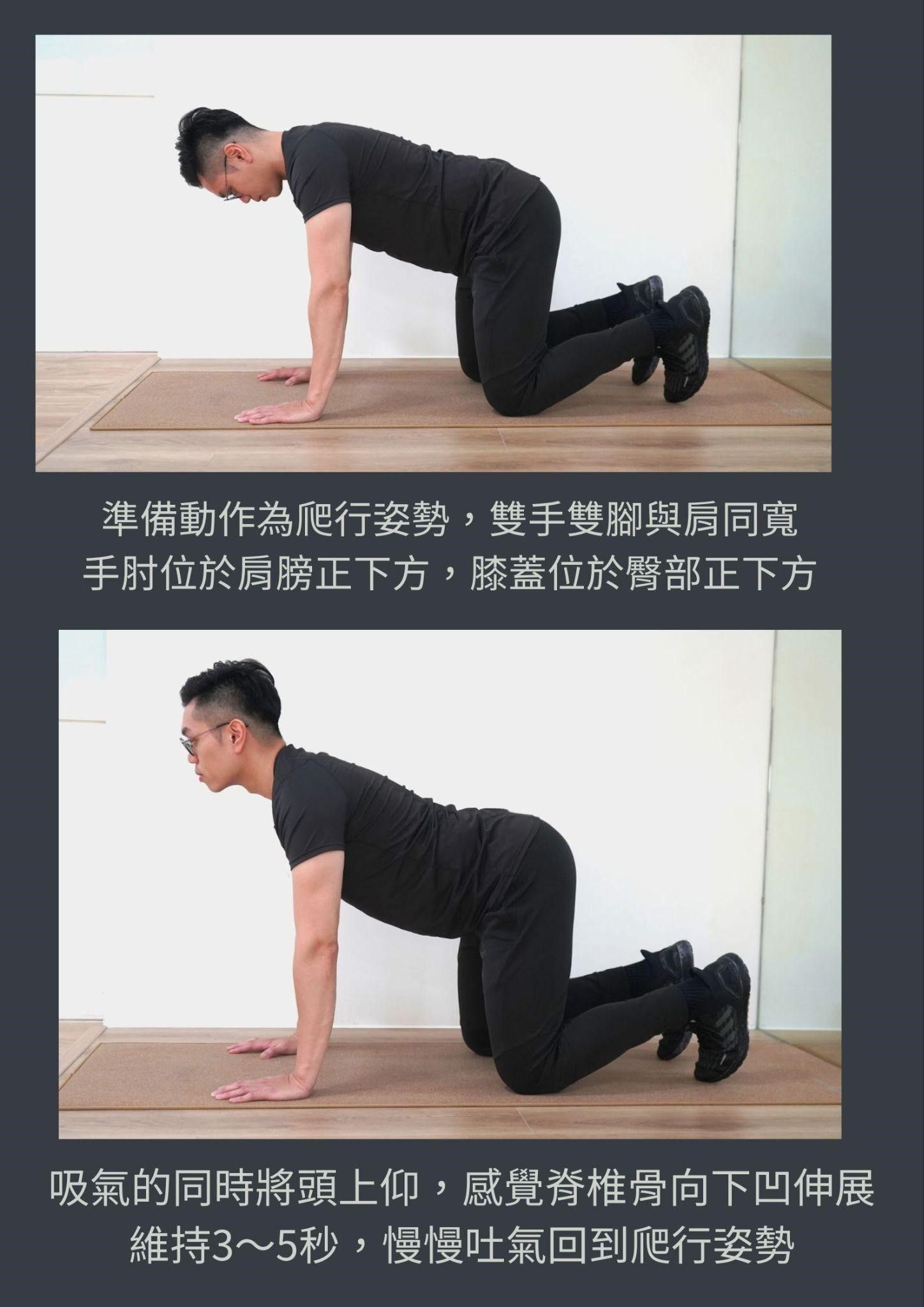「牛式」與「貓式」是一組常見且溫和的動作,兩者交替進行時,可以帶動整條脊椎從尾椎到頸椎的延伸,帶動整個背部放鬆下來。
