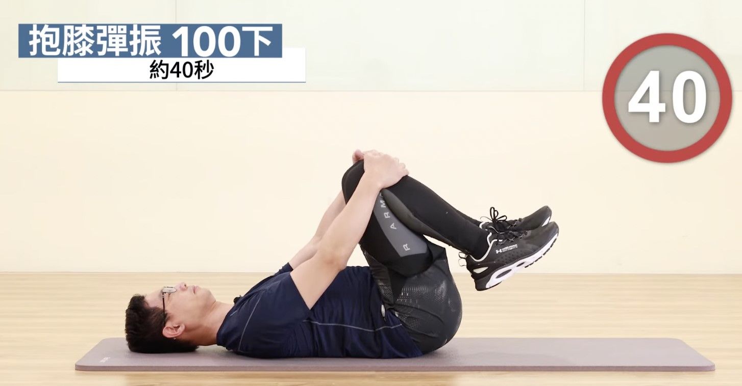 3.接著用手臂的力量稍微讓膝蓋靠近下巴的方向,保持韻律感,來回彈震 100 下