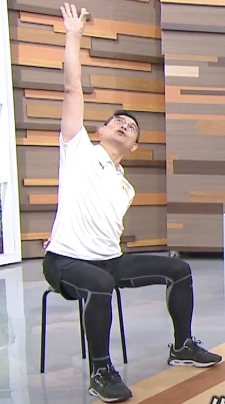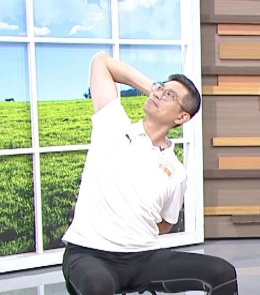 坐著左手背到後方,右手向上拉,右手慢慢向上延伸,之後手掌慢慢順時鐘轉,轉完後再逆時鐘轉,這時整個右側處於伸展開來的狀態(如下圖 )。