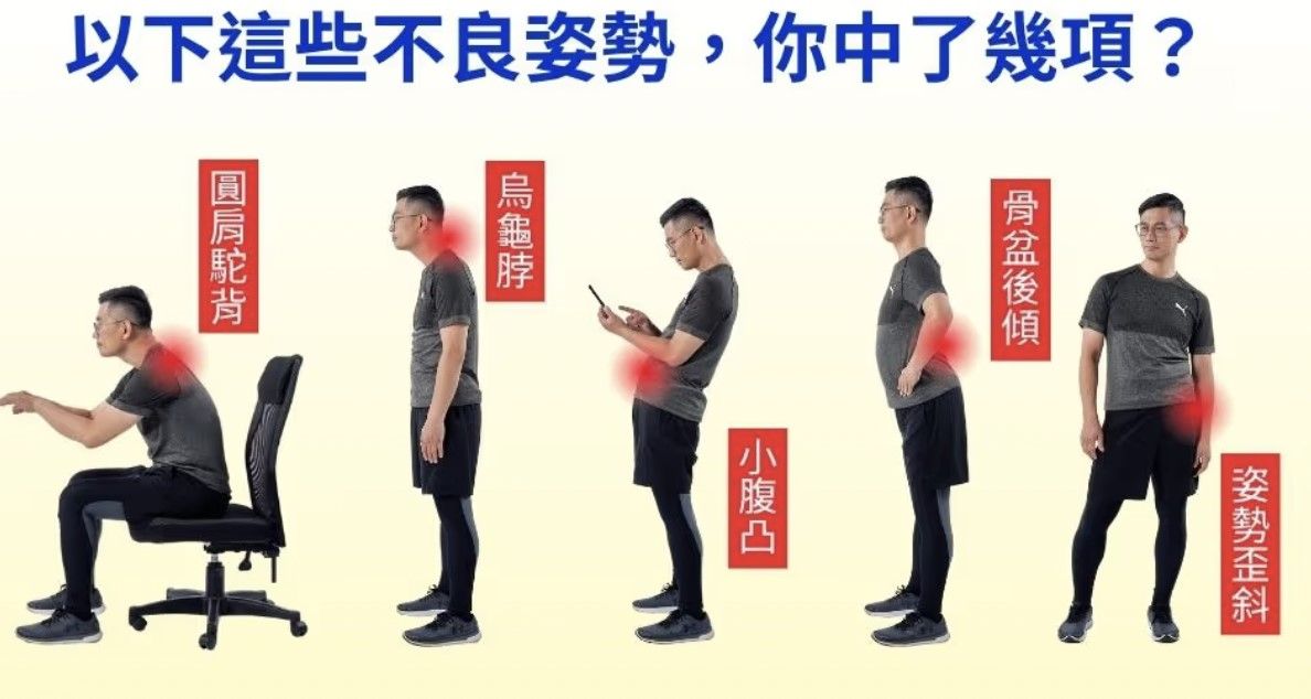 日常生活中的站姿或是坐姿不良,會導致身體重心不平衡,也容易讓下背肌肉緊繃,像是駝背、三七站、身體歪斜、骨盆前傾等。